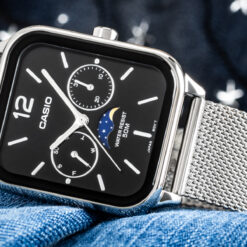 This Casio watch has a case made of stainless steel with a diameter of 34 mm and is fitted with a stainless steel band. Inside the case lies a Casio movement and the watch features a Mineral crystal.