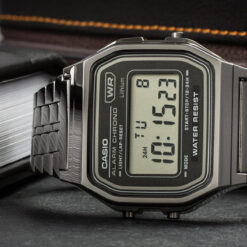 This Casio watch has a case made of plastic / resin with a diameter of 33.2 mm and is fitted with a stainless steel band. Inside the case lies a Casio movement and the watch features a Acrylic crystal.