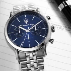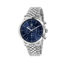 The Maserati Epoca Chronograph R8873618024 is a men’s chronograph watch that combines sporty elegance with advanced technology. Equipped with a Miyota JS20 quartz movement, it offers stopwatch functions up to 30 minutes and an additional sub dial with 24-hour time. A blue dial with a sunburst effect and guilloche sub dials add a unique touch. The model is water resistant to 10 atm and has a luminescent coating, making it an ideal choice for active men.