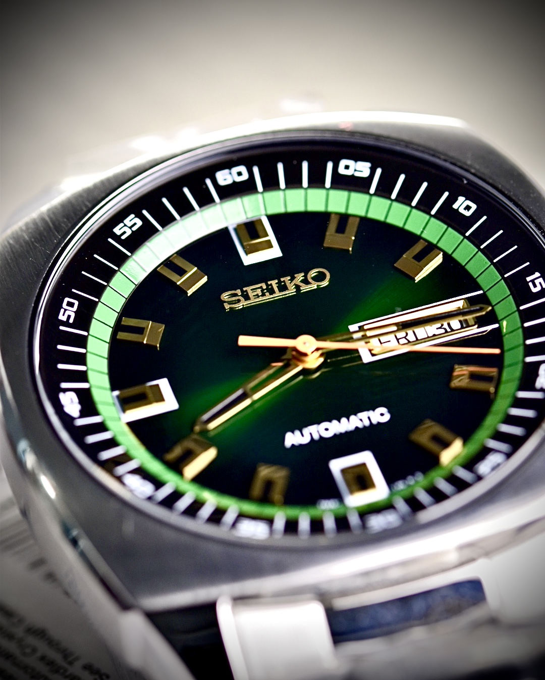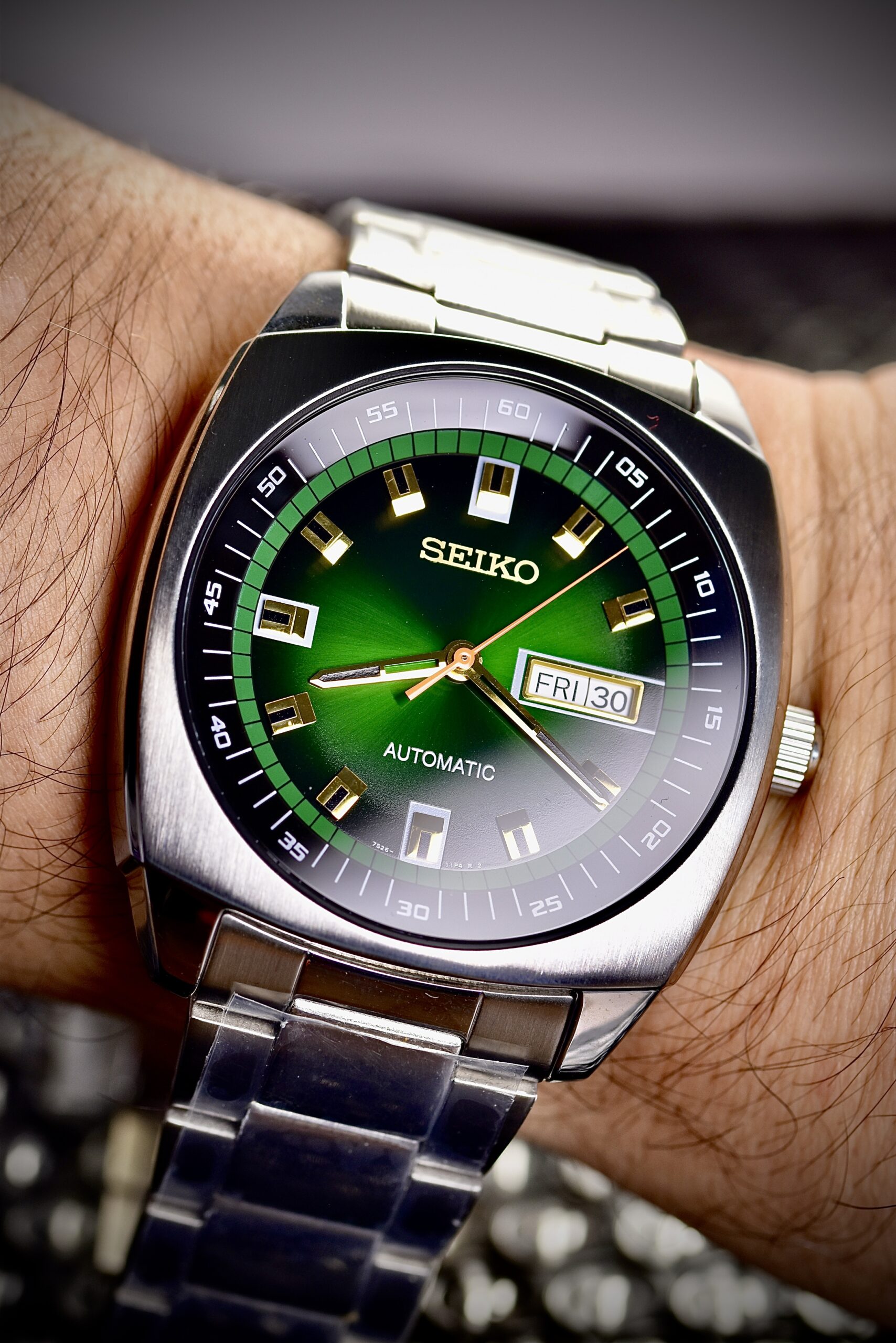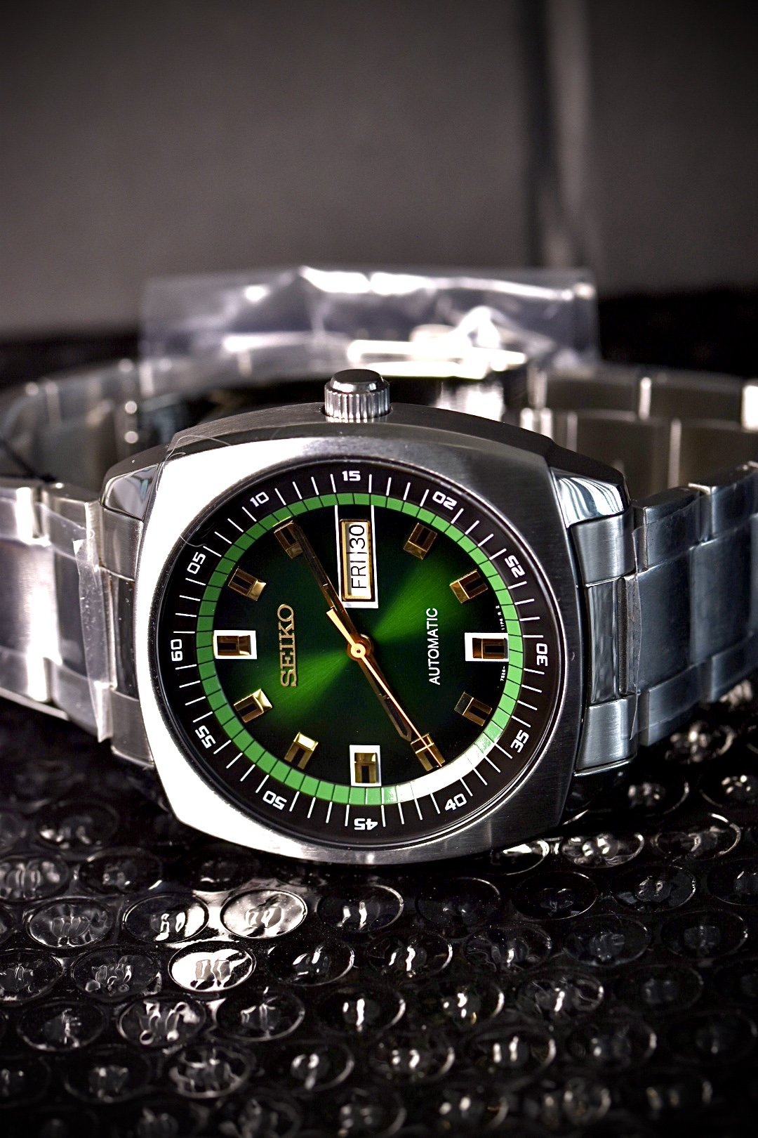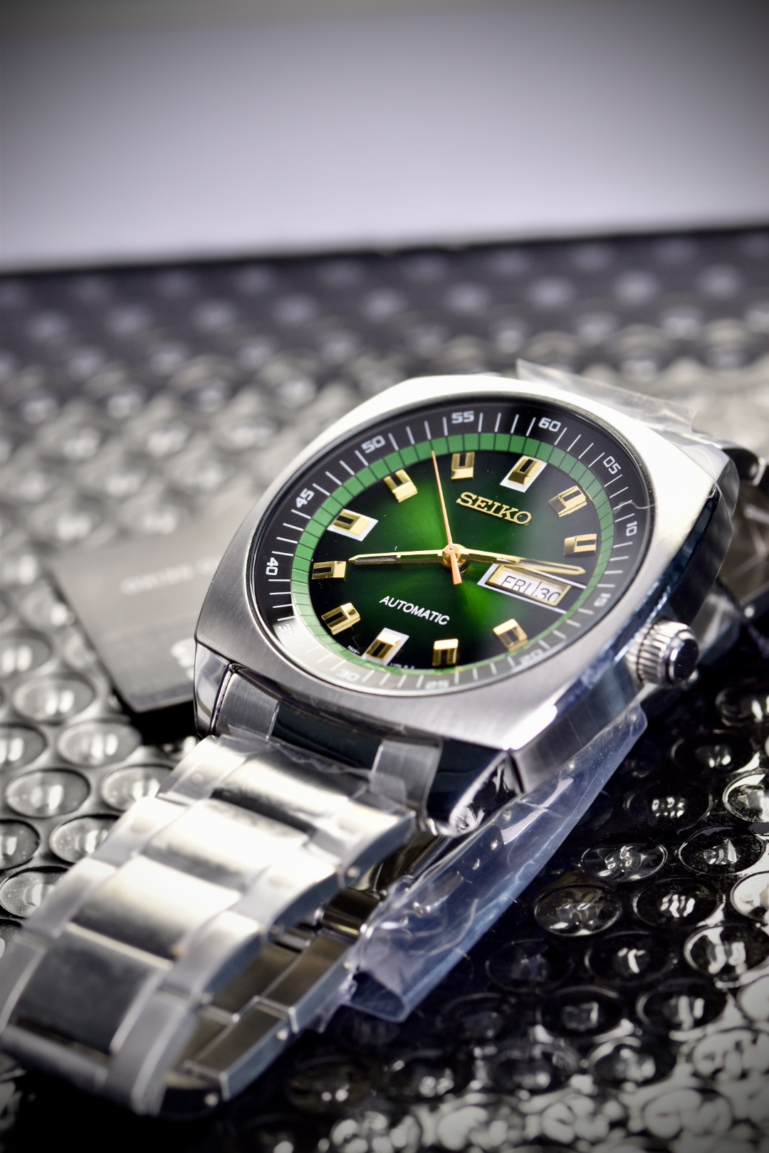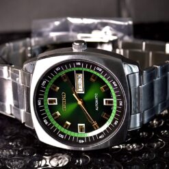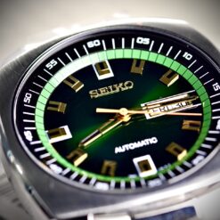 The Seiko SNKM97 is a 1970s-inspired automatic watch from the Recraft Series, featuring a 43.5mm cushion-shaped stainless steel case, a vibrant emerald green sunburst dial with orange accents, and an exhibition back. It is powered by the 7S26 automatic movement and includes a 24mm bracelet.