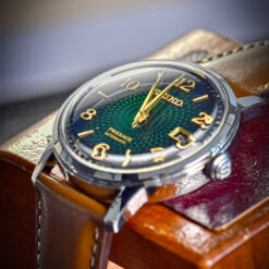 This classic Cocktail Time men’s Seiko Presage watch features 38.5 x 12mm stainless steel case housing an automatic movement, a green textured dial, gold tone number and baton hour markers and hands plus a handy also a date display window. A tan calfskin leather strap completes the look. 50m water resistant.